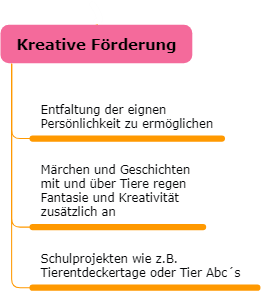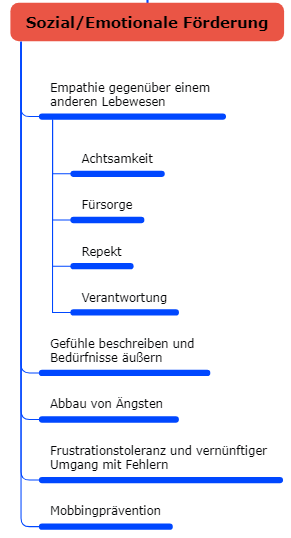 In der Tiergestützten Pädagogik nutzen wir die motivierende Anwesenheit unserer Tiere besonders im Bereich des sozialen Lernens. Der Umgang mit den Tieren bietet die Möglichkeit, sich einem Lebewesen gegenüber zu öffnen und positiv zuzuwenden. Die Tiere können Brücken bauen und den Kindern helfen, in Kontakt zu treten und Gefühle auszudrücken. Das Übertragen von Verantwortung durch die Arbeit mit den Tieren fördert in hohem Maße das Selbstwertgefühl, die Selbstwirksamkeit und das Selbtbewusstsein. Die Kinder entdecken dabei schrittweise Sozialkompetenzen, die zu erkennbaren Verhaltensänderungen führen und sich auch auf die Schule positiv auswirken können.