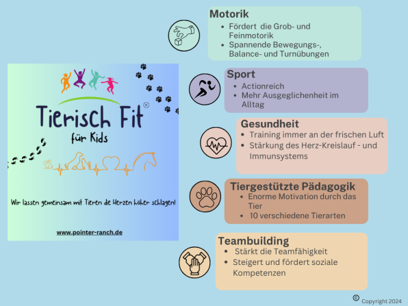 Tierisch fitte Kids - ist ein nachhaltig innovatives Lern- und Bewegungsprogramm, welches mit sportlichen Fachleuten speziell auf den motorischen Förderbedarf von Kindern  und Jugendlichen konzepiert wurde. Diese Bewegungseinheiten werden in Verbindung mit unseren Tieren und einem erfahrenen Trainer begleitet und durchgeführt.